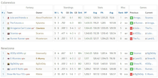 As we've come down to the last week of the regular season, the playoff picture looks pretty clear. Land O' Nutts, Show Me Your TDs, and Runner Runner have been eliminated from contention. Sicarios need a statistical-anomaly kind of miracle to take a wildcard spot (scoring over 200pts more than Arrogance Can't Lose). All that's left for week 12 is finalizing the rankings going into the playoffs. Colorexico's bye is still in contention between The Futures and Julio and Friends, while Newizona's top two spots are locked up. ACL and BgDkDdy will fight over which side of the playoff bracket they'll be placed.